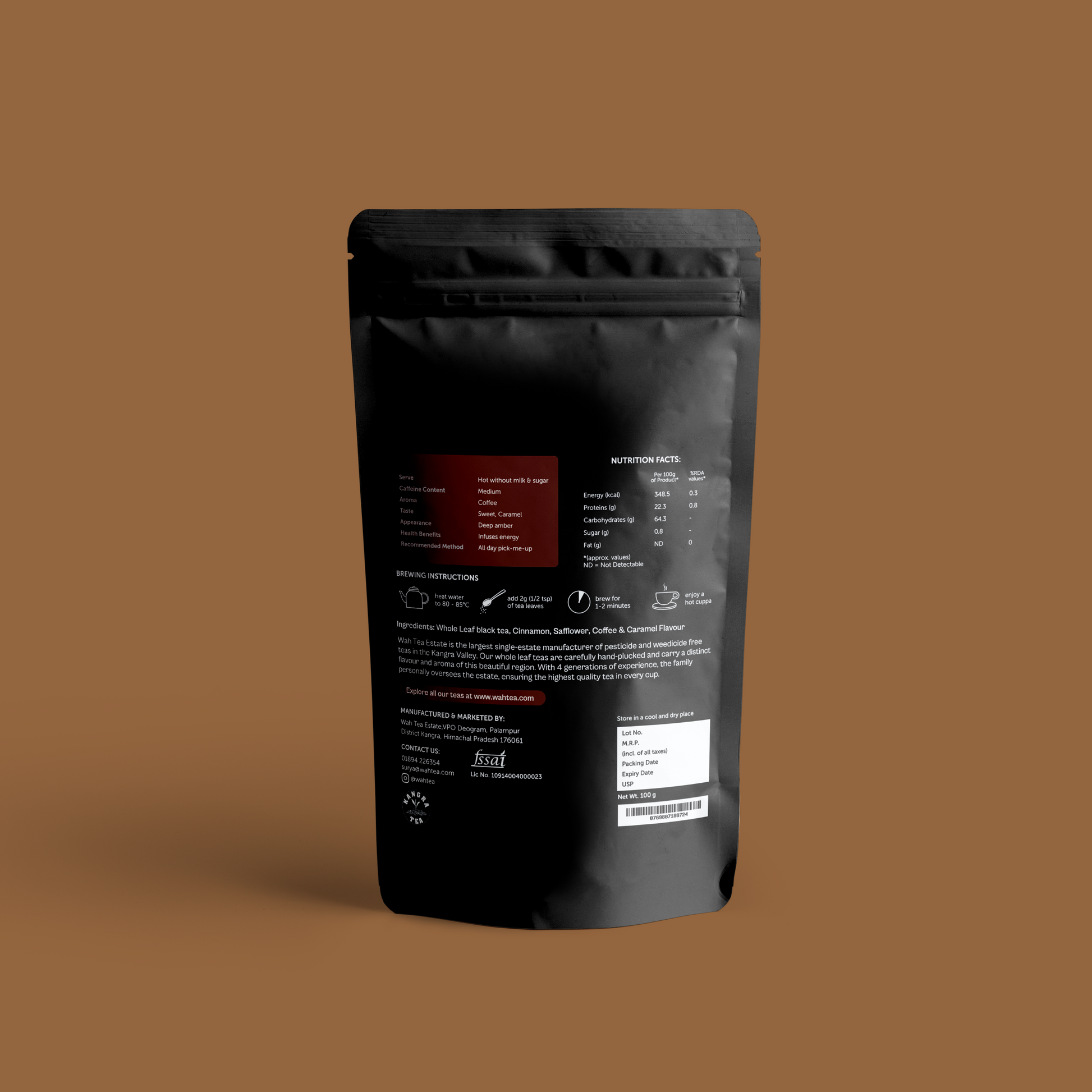 Tea Blend: Whole leaf black tea, Whole Leaf Black Tea, Cinnamon, Safflower, Coffee & Caramel Flavour