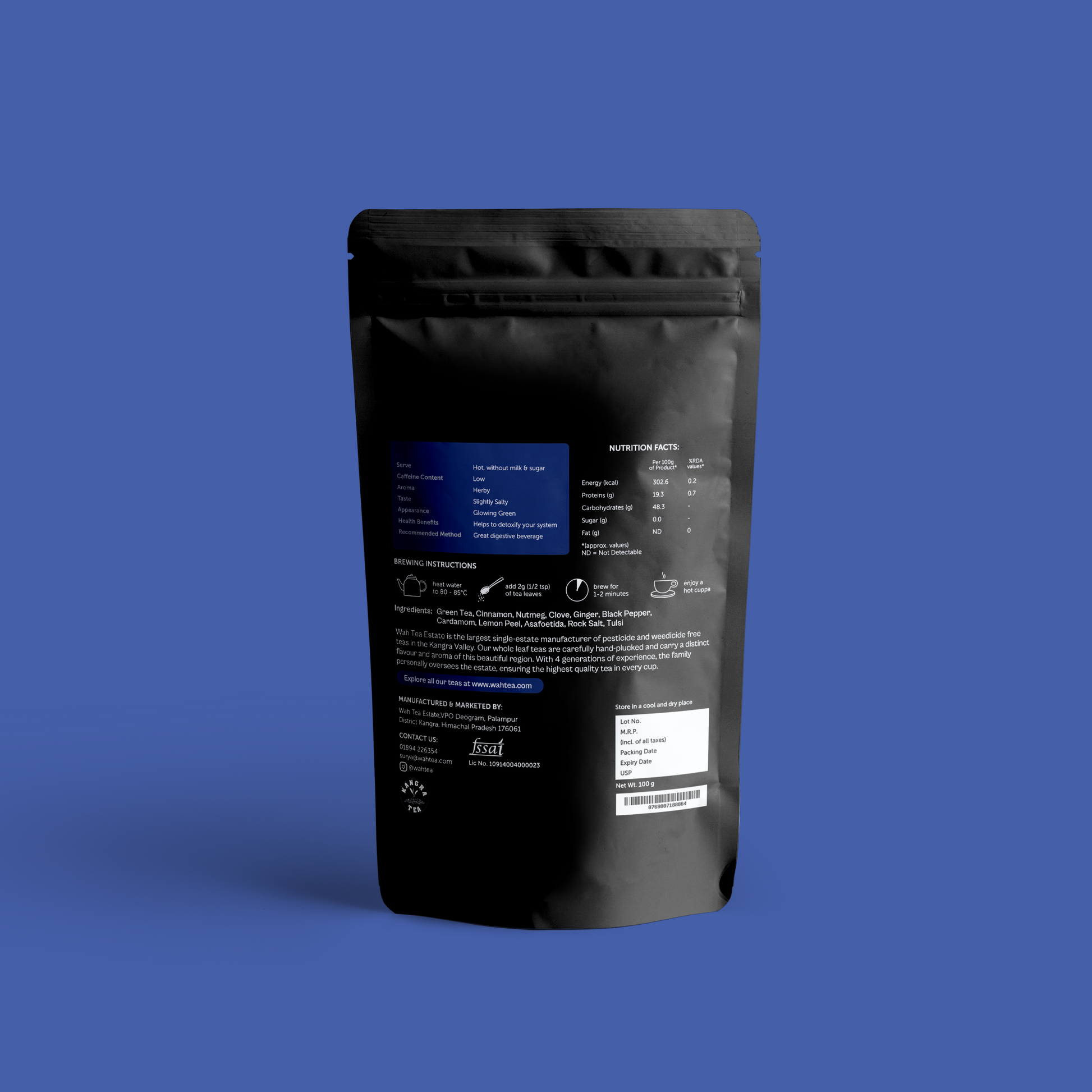 Tea Blend: Whole Leaf Green Tea Blended With Ginger, Cinnamon, Nutmeg, Cloves, Black Pepper, Cardamom, Lemon Peel, Asafoetida, Rock Salt and Tulsi.